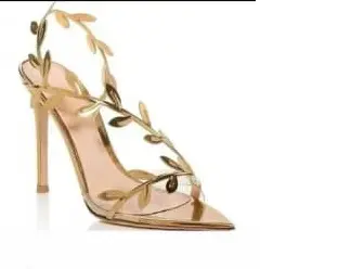 A high-heeled stiletto sandal in metallic gold. It features a pointed toe and elegant, vine-like straps adorned with gold leaf motifs that wrap around the foot and ankle. The design is delicate, decorative, and inspired by a Greek or Roman goddess aesthetic. The material appears glossy and luxurious, giving the shoe a statement, evening-wear look.