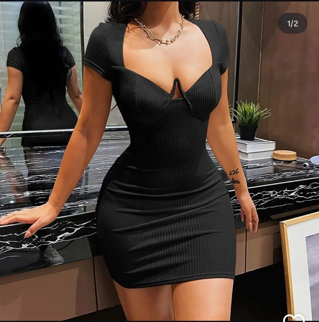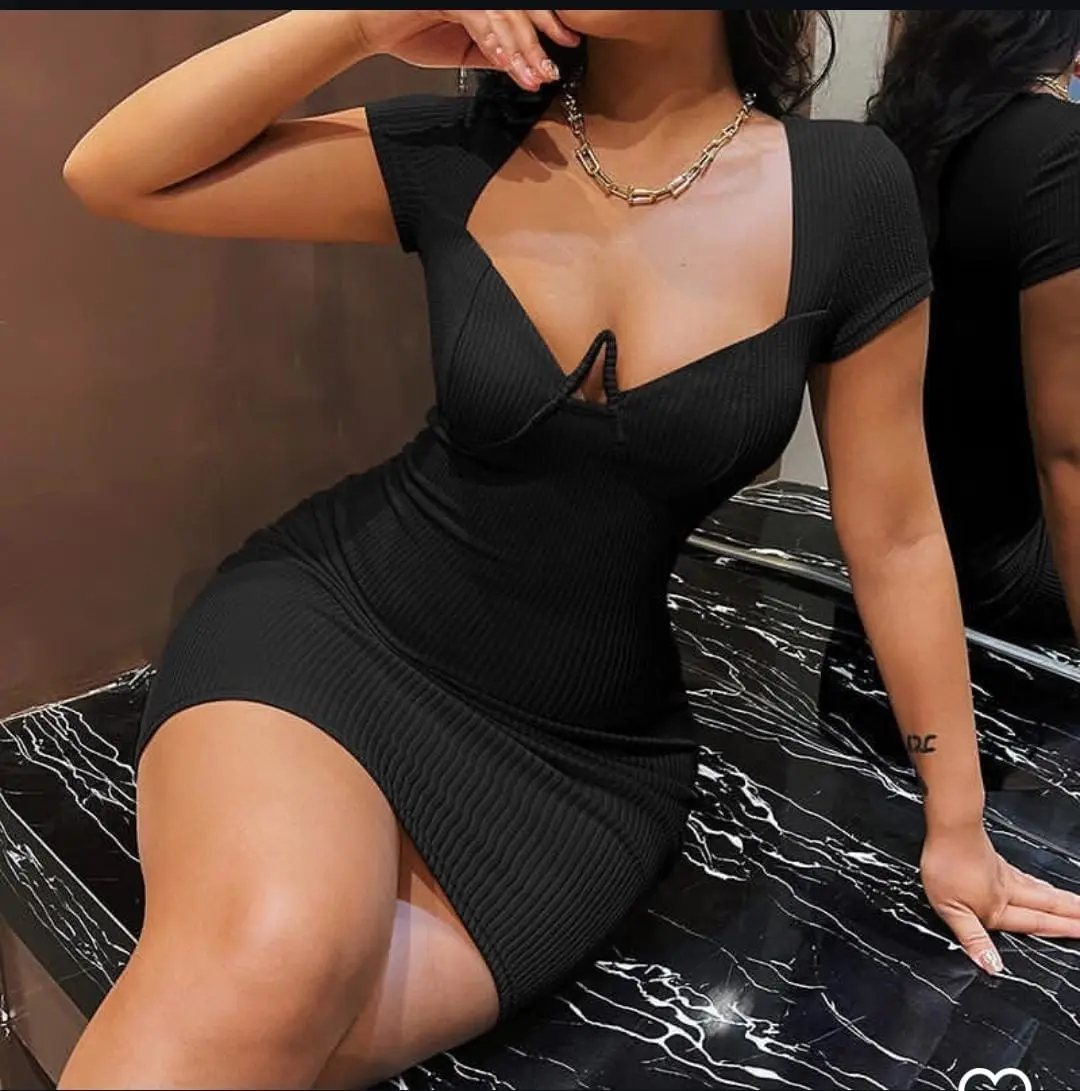 Short-sleeved, ribbed bodycon with a deep V neckline for an understated but striking vibe.