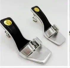These are silver open-back heeled sandals featuring a square toe and a wide front strap. The strap includes a decorative metallic detail for added style. The insole is black with a gold circular accent near the heel. The design is modern, sleek, and suitable for dressy or semi-formal outfits.