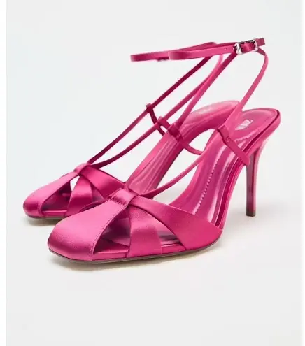 These elegant fuchsia high-heeled sandals feature a glossy satin finish that gives them a luxurious, standout look. The design includes slender crisscross straps over the toe area and delicate wrap-around ankle straps with an adjustable buckle for a secure, customizable fit. A sleek stiletto heel adds height and sophistication, making these heels perfect for evening wear, parties, weddings, or any outfit that needs a vibrant pop of color.